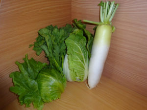 学校で取れたそうです。(写真は近所の八百屋さんで買ってきたもの。実際は、レタス5玉、白菜、大根、春菊とどれも生き生きしていました!)